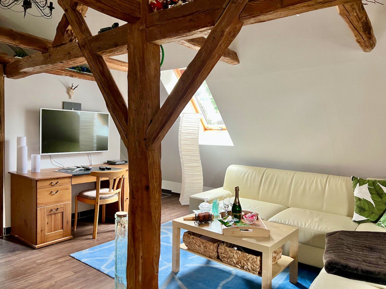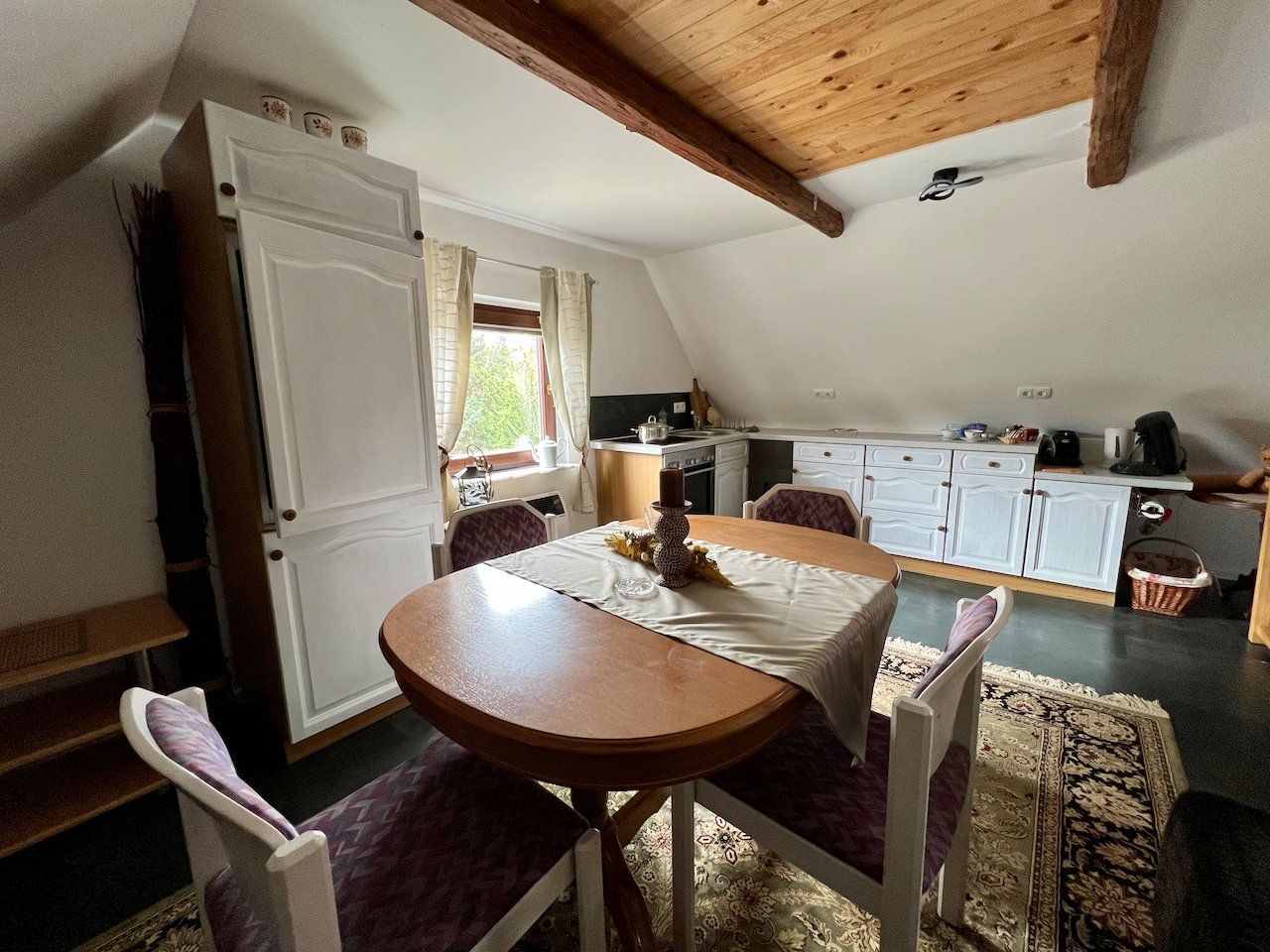 Die Ferienwohnung ist ca. 80 m² groß und voll ausgestattet. Sie bietet Schlafmöglichkeiten für bis zu 4 Personen. Im liebevoll eingerichteten Wohnbereich befindet sich ein Doppelbett, eine Treppe führt zu einem weiteren Doppelbett im Spitzboden.